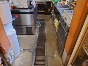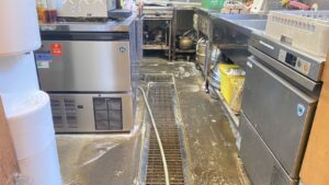 さらに厨房床では、長年の油や食材汚れがこびりついた状態。